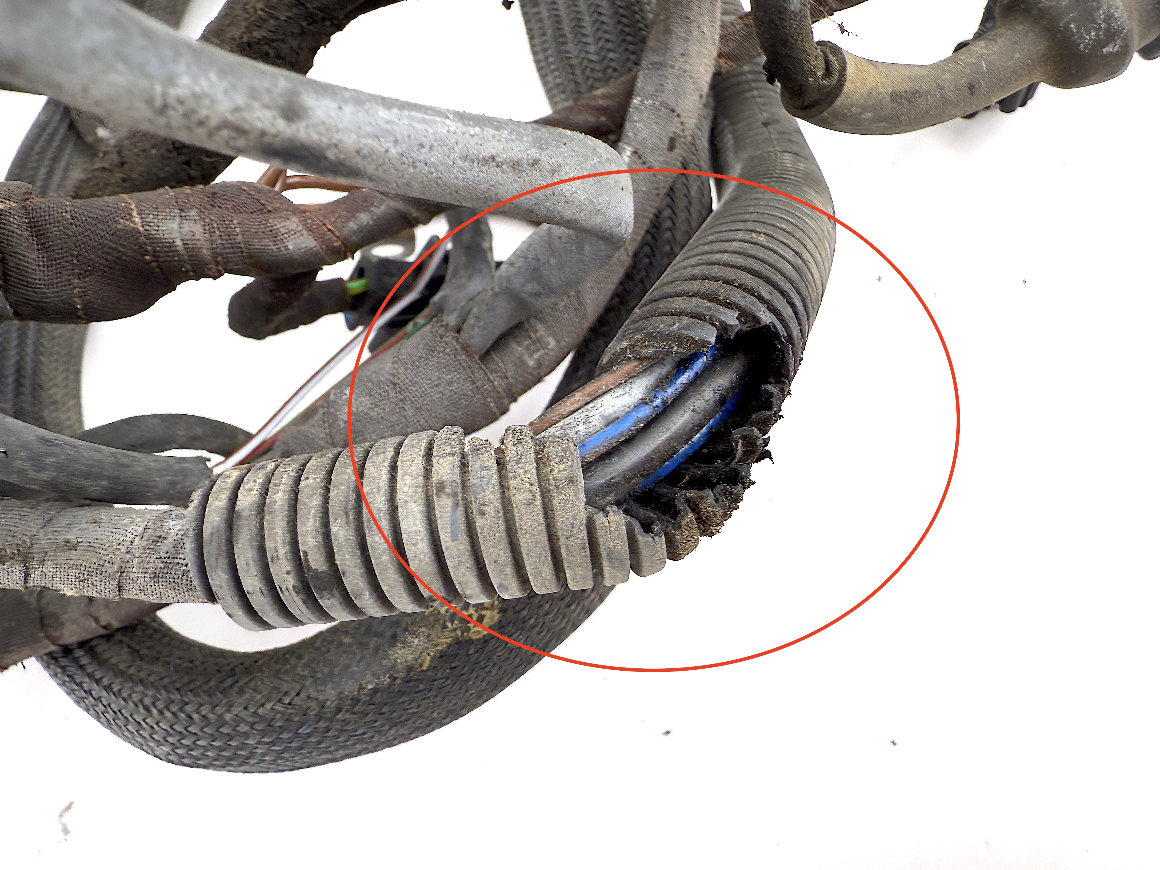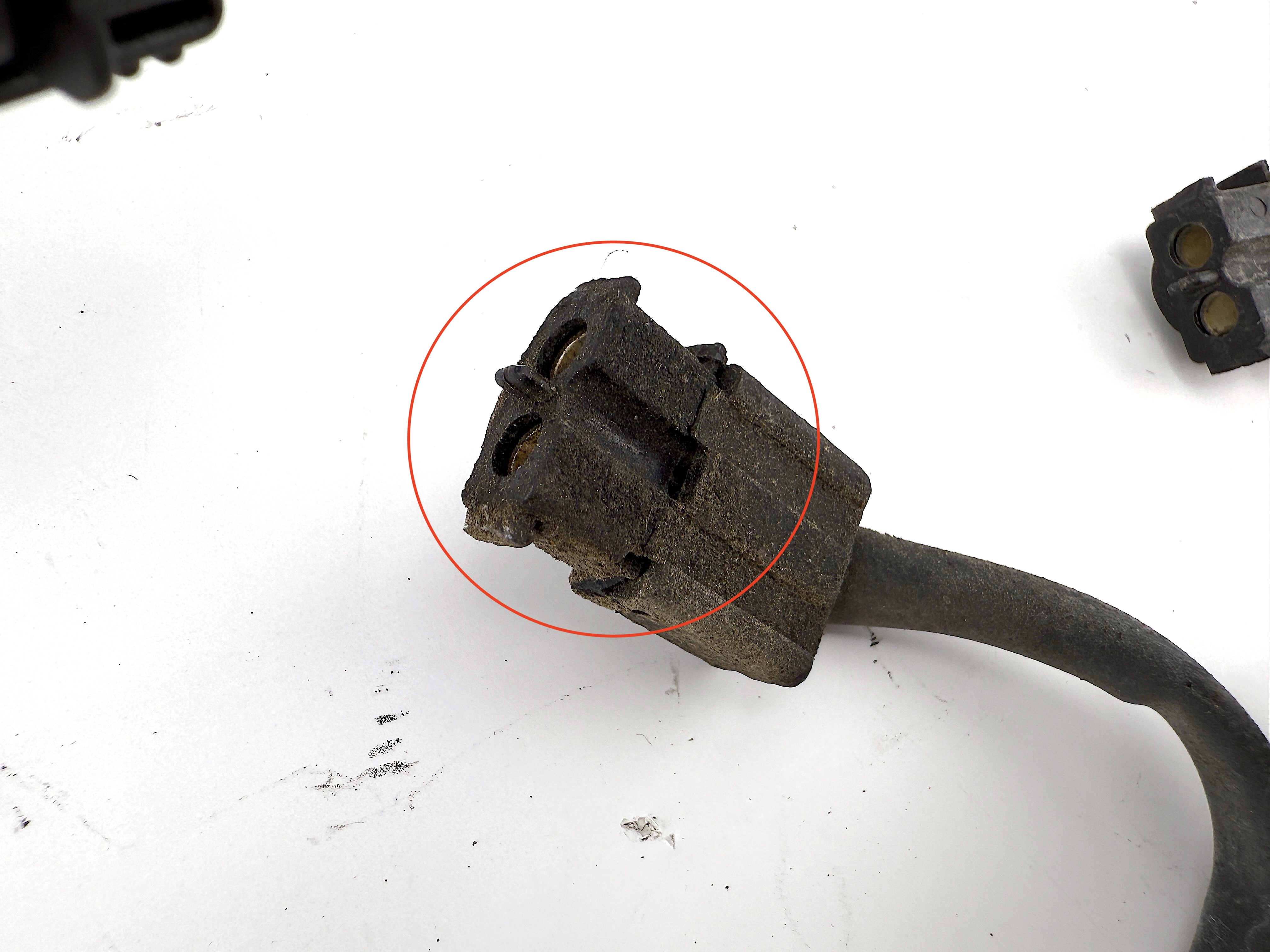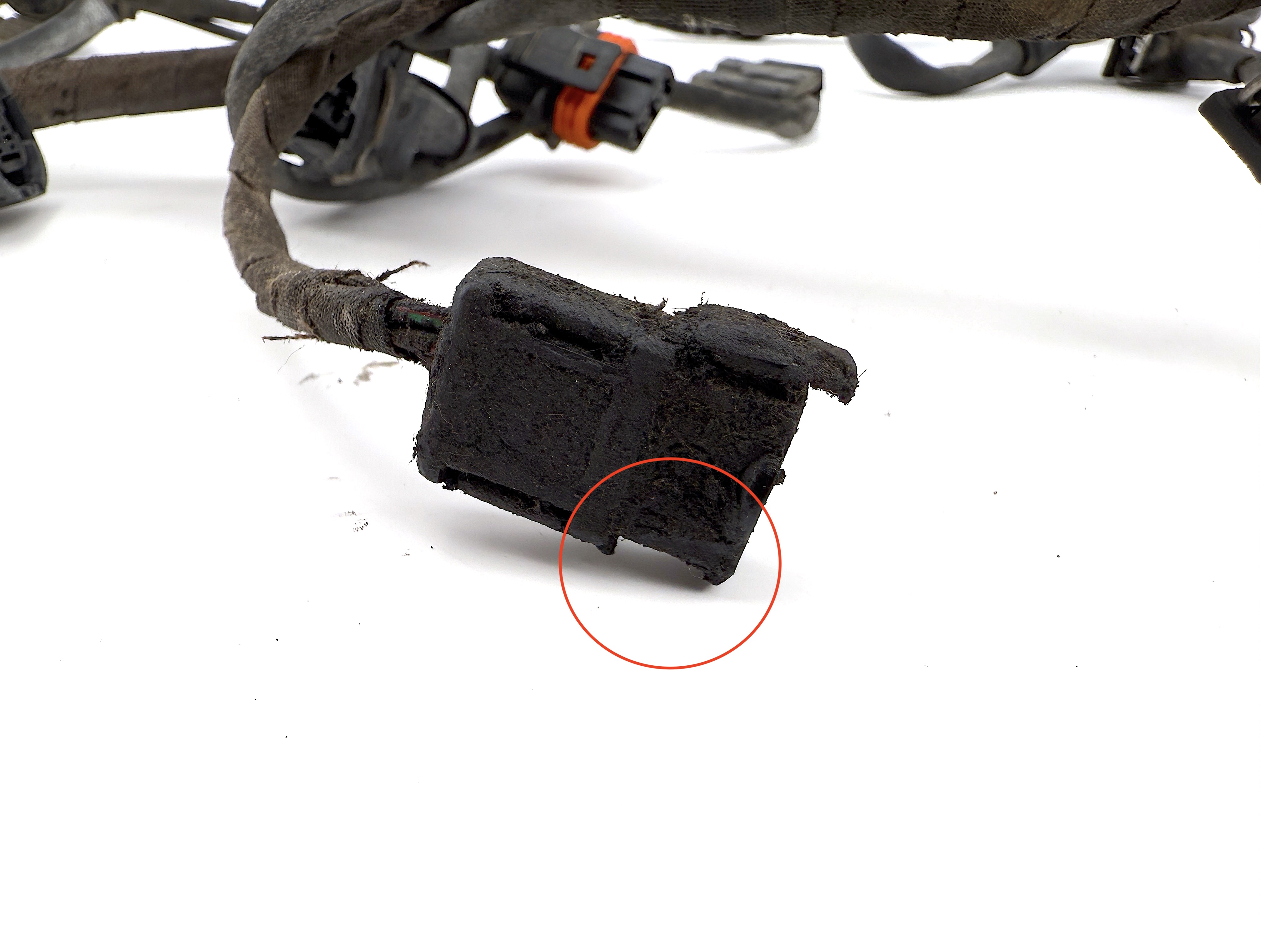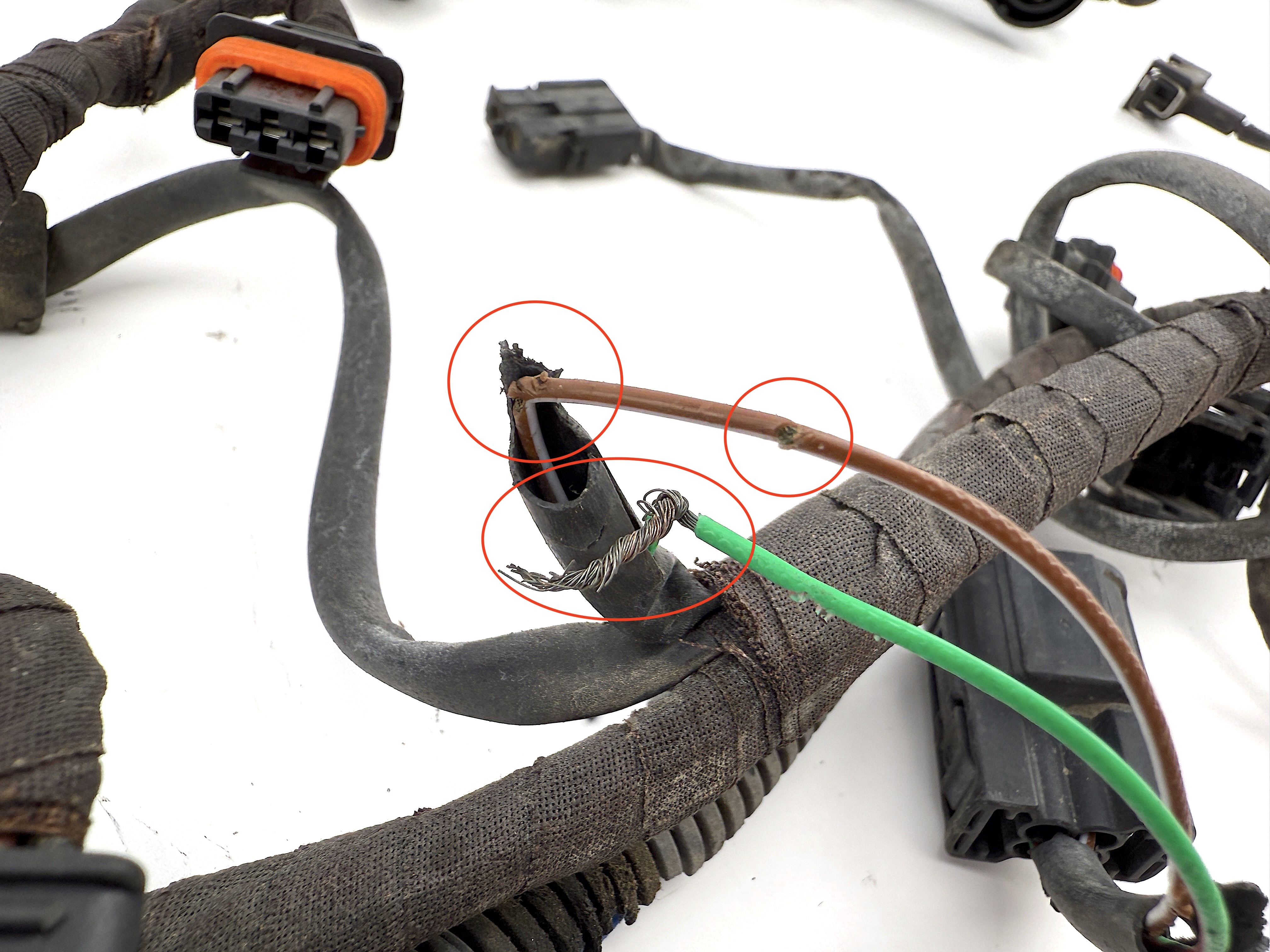 - Defective part. Two wires are cut. Multiple connectors has broken mounts. Damaged wire insulation. Other wires and connectors in good condition.