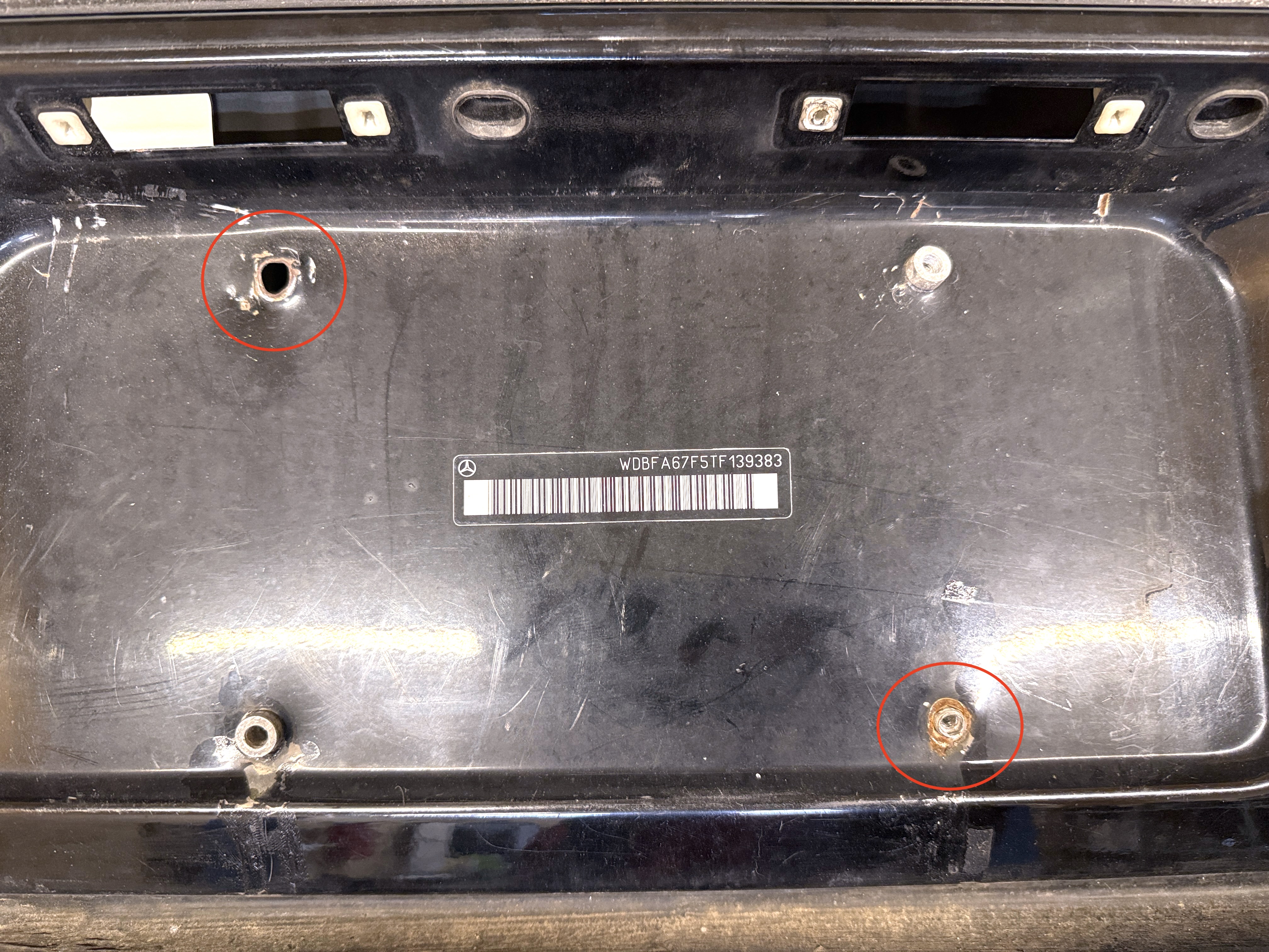 - For US market license plate. Damaged rivets for number plate holder. Rust and dents on body panel. Cosmetic defects, scratches.